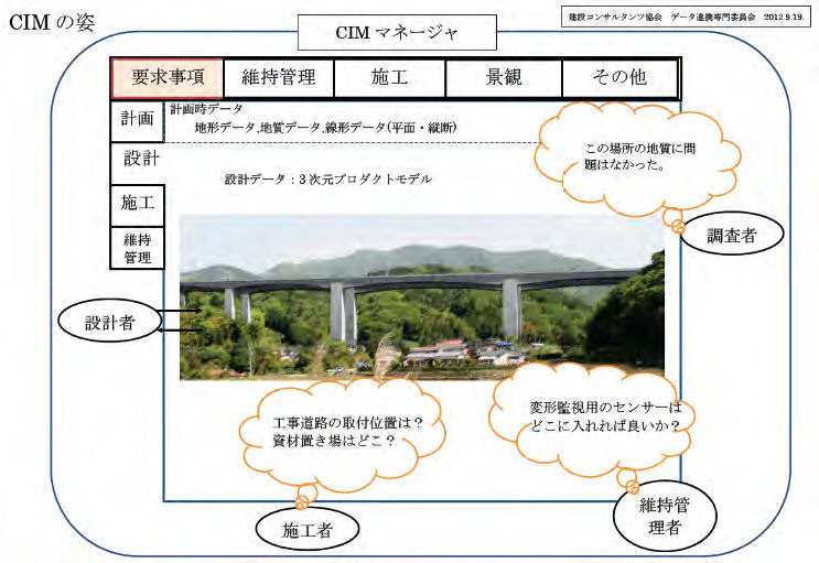 また、建築分野でのBIM(ビルディング・インフォメーション・モデリング)活用からヒントを得たと思われるものとしては、プロジェクト関係者が1つのモデルを見ながら意見交換を行い、それをまとめていく「CIMマネージャー」の役割と重要性を指摘した部分もありました。