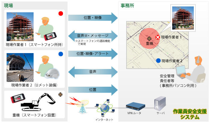 作業員にはAndroidのスマートフォンを持ってもらい、そのGPS機能によって現在位置をデータセンターに自動送信します。その情報を地図上に表示することで、安全管理責任者はだれがどこにいるのかが分かります。