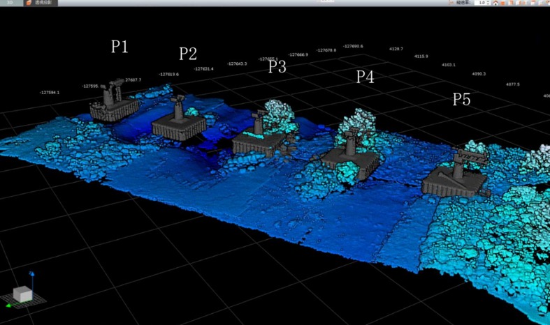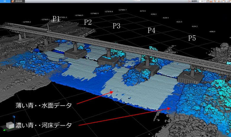そこで、水中の河床形状はグリーンレーザー、地上の橋桁・橋脚や河川構造物などは通常のレーザーによって点群データを取得し、合成することで橋脚と河床が一体化した点群データが出来上がります。