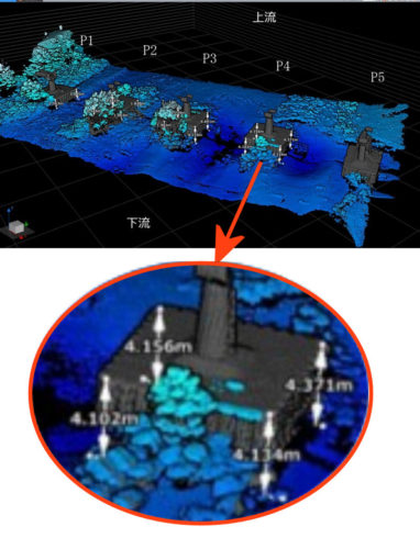 そして、橋脚周辺の河床の洗堀状況を把握したり、洗堀深さを計測したりできるのです。
