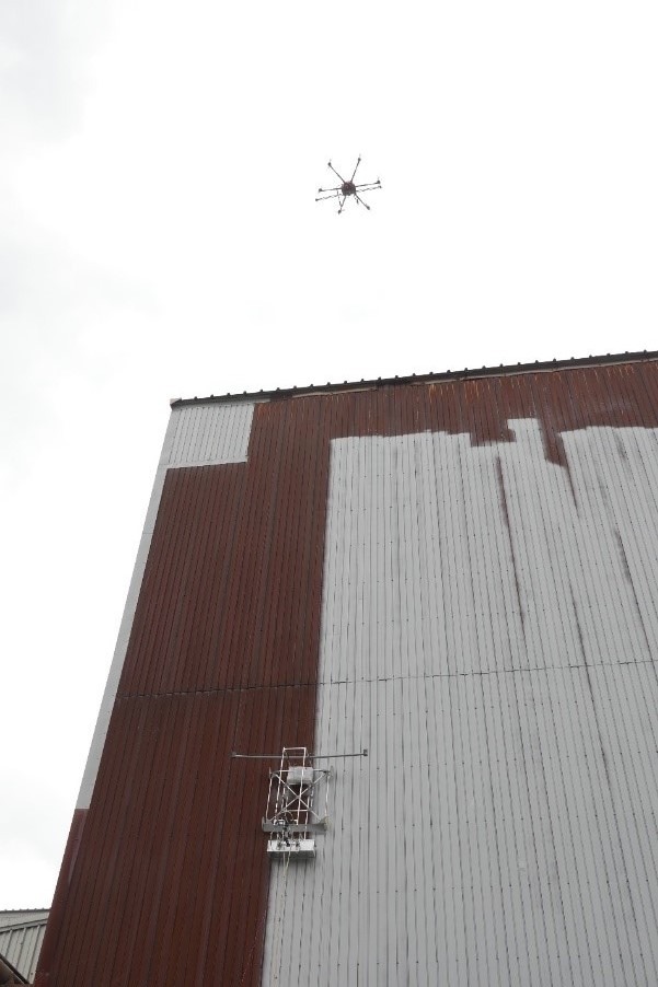 実証実験中の現場 。ドローンが外壁吸着ロボットを吊り上げながら塗装を行っている
