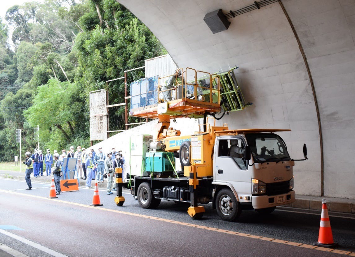 トンネルの入り口付近には、1台の高所作業車が止まっており、作業台にはトンネルの内壁に向けて何やら装置が取り付けられているようです。