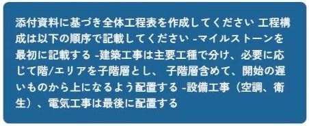 ここでCAD図面ファイルなどを読み込ませて、工程表の表示順や工種の分け方などをプロンプトで指示すると、AIがその条件に従って自動的に工程表のバーを引いてくれるのです。