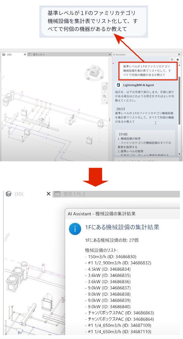 BIMソフト「Revit」をAIで操作するアドインツール「Lightning BIM AI Agent」の操作例。BIMモデル中のファミリ種類や数を言葉で命じてカウントし、数量表などを作成できる