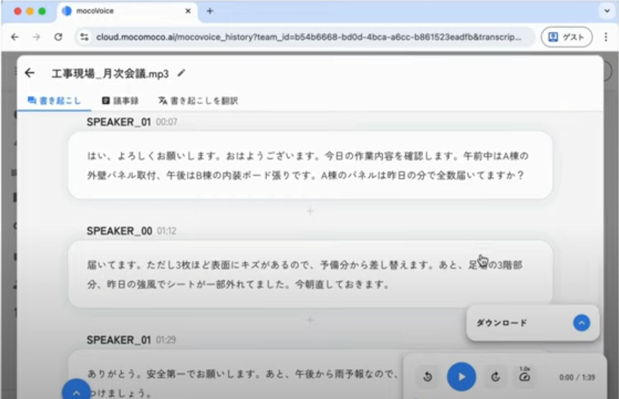 使い方は現場での録音・録画データを、WebブラウザーからmocoVoiceサイトにアップロードするだけです。するとAI(人工知能)が話者を認識して、テキスト化してくれます。