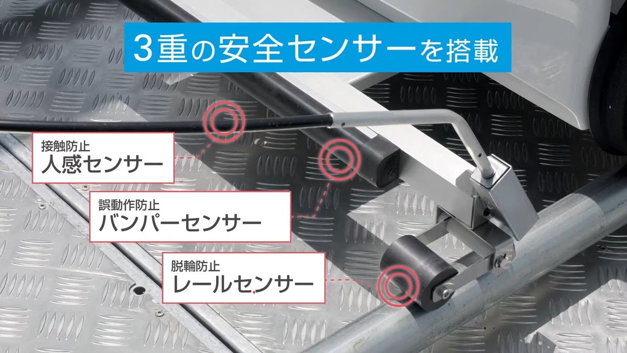 本体には人との接触を検知する人感センサーや誤作動を防止するバンパーセンサー、脱線を検知するレールセンサーと3つのセンサーが搭載され、3重の安全対策が施されています。