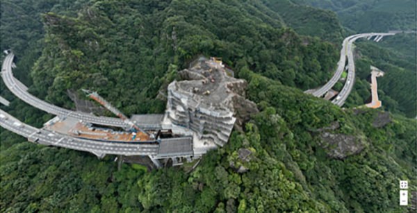 この現場では、トンネル上にそびえる高さ約70mの岩山を、落石防止のために撤去しています。その体積は約9万5000m3にも上ります。