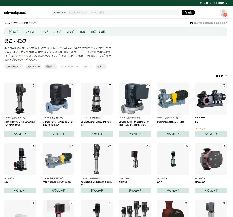 BIMobjectには荏原製作所専用ページが開設され、サイトからダウンロードできる同社のBIMデータの一覧が掲載されています。これらのデータは、サイト内の「配管」カテゴリーに分類されています。