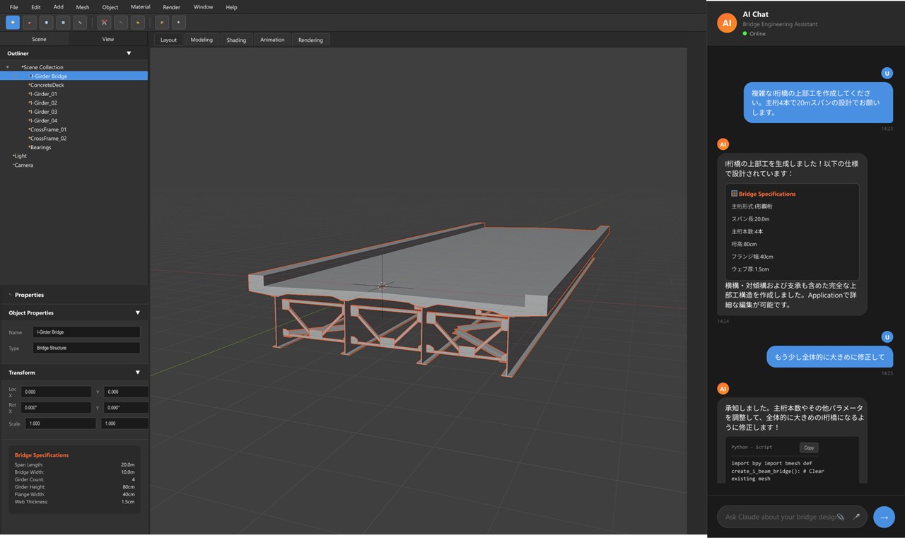 人間が「少し幅を広げて」「断面を大きめに修正して」と言えば、AIがモデルを即座に更新してくれるのです。