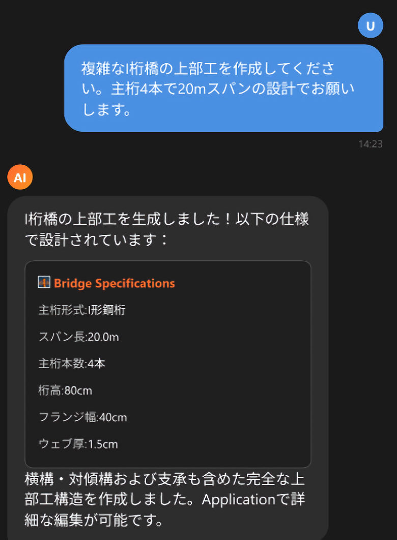 設計者はチャットで要望を入力するだけ。AIは与えられた指示を解釈し、設計条件に基づいて橋梁上部工のCIM/BIMモデルを自動生成します。