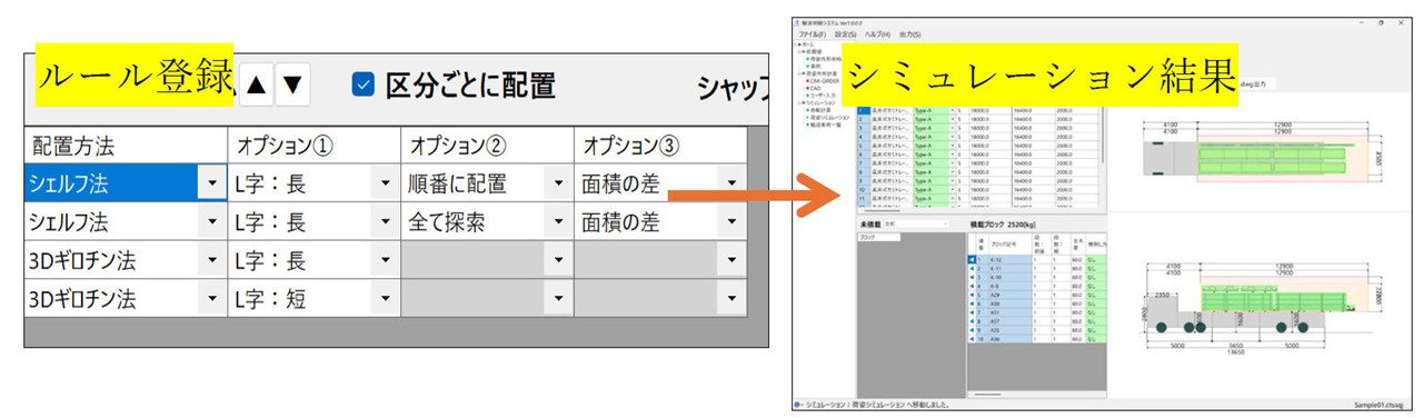 トラックの積載可能範囲や部材間隔、計算方法を設定すると、積載シミュレーション結果を即時出力し、画面上で確認できます。