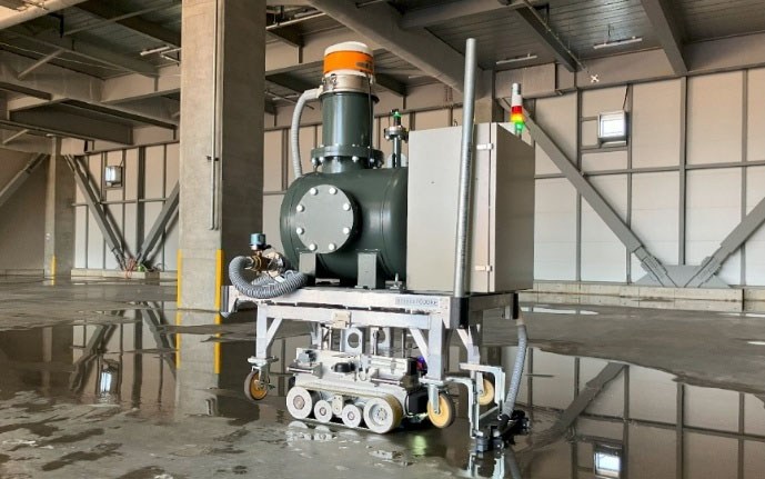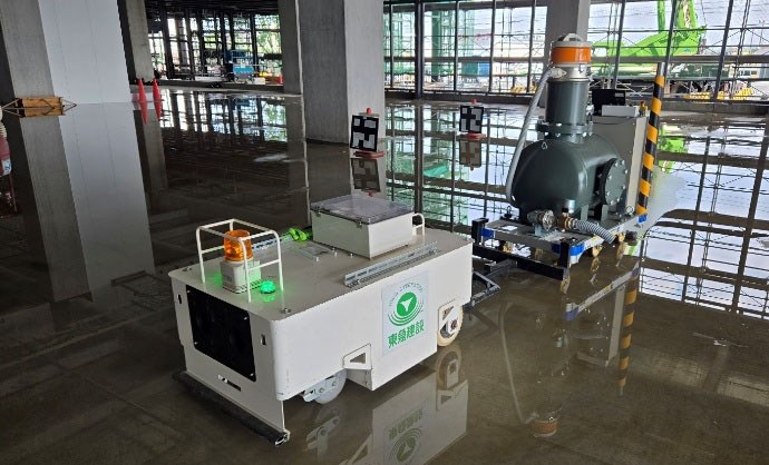 開発にあたっては、建設現場特有の泥やごみを含んだ水でも詰まりにくい構造とし、耐久性も重視しました。物流倉庫の新築現場で行った実証実験では、床面積750m2の水たまりを1時間当たり100m2のスピードで除去でき、人力と同等の作業効率となりました。