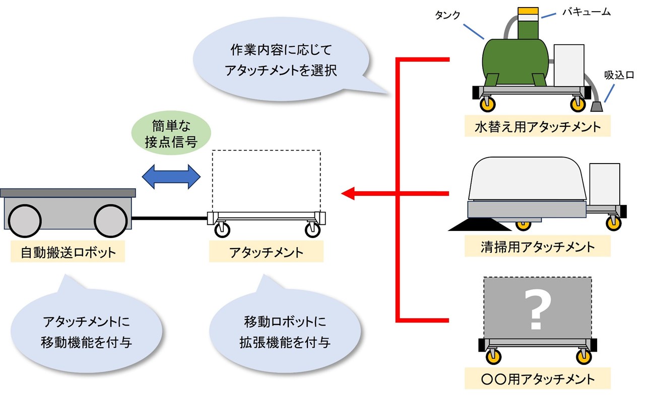 そこで自動搬送ロボに水たまり除去用アタッチメントを取り付けて走らせ、水たまり除去作業にも活用するのが狙いです。