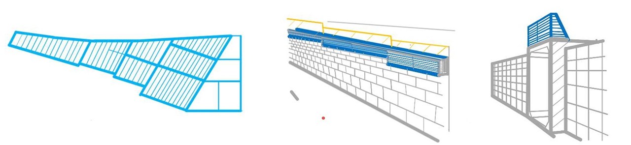 建設用3Dプリンターで施工された構造物のイメージ図。左から重力式擁壁、垂直盛土の笠コンクリート、ボックスカルバート上の擁壁