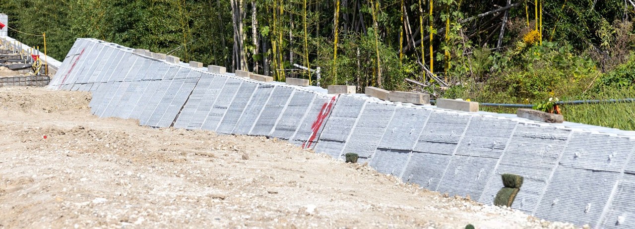 まずは総延長106.7mにもおよぶ重力式擁壁の3Dプリンター施工です。