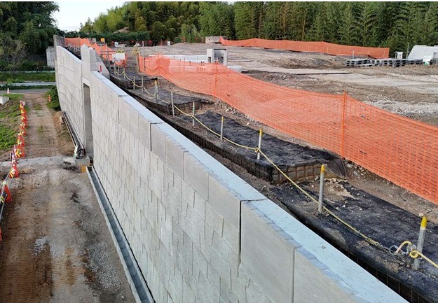 この現場では、重力式擁壁のほかにも、「アデムウォール工法」で施工された垂直盛土の笠コンクリート(総延長157.3m)や、ボックスカルバート上部の擁壁(9.2m)にも3Dプリンター施工が採用されました。