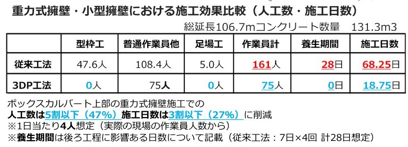 また笠コンクリート工では作業員延べ人数が204人から71人、施工日数が58日から17.75日に減り、ボックスカルバート上部の擁壁では同様に19.2人から7人、11.8日から1.75日に減りました。