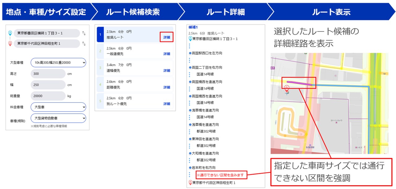 「大型車ルート検索機能」は、車両サイズを入力すると大型車が通行できるルートだけを検索できるものです。