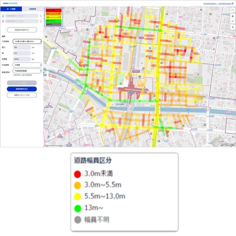 Area Markerは、店舗や拠点の情報を地図上で一元管理できるツールですが、今回、新たに「道路幅可視化機能」と「大型車ルート検索機能」が追加されました。