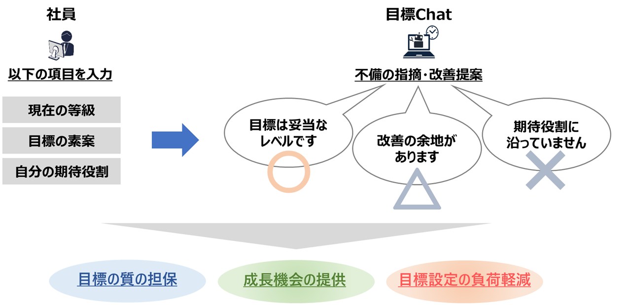 社員が目標の素案を入力すると、生成AI(人工知能)がその人の現在の等級や役割、制度に照らして、目標の内容が適切かどうかや改善の余地などを具体的に指摘してくれます。