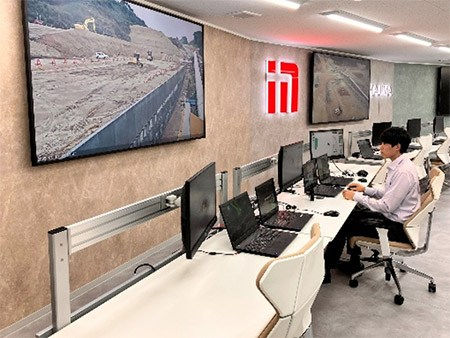 オペレーションルームで施工現場の全体像を見ながら、ブルドーザーや振動ローラー、ダンプトラックの動きをまとめてコントロールします。