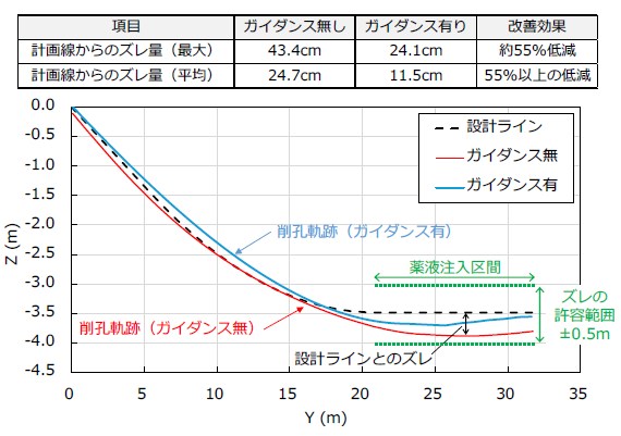 ガイダンスあり(青線)となし(赤線)による削孔軌跡のずれ