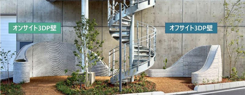 今回、施工したのはベンチやプランターと一体化したRC造の曲線壁です。工場に設置したプリンターで造形した部材を現場に搬入して設置する「オフサイト方式」と、構造物の現場の施工位置に置いて造形する「オンサイト方式」との両方にチャレンジしました。
