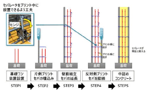 鉄筋は、埋設型枠の片側ができたところで組み立てて、セパレーターをコンクリートに埋め込むようにして、もう片側の壁面を造形します。そのため、造形後は従来の型枠が3Dプリンター製の型枠に置き換わったようになります。