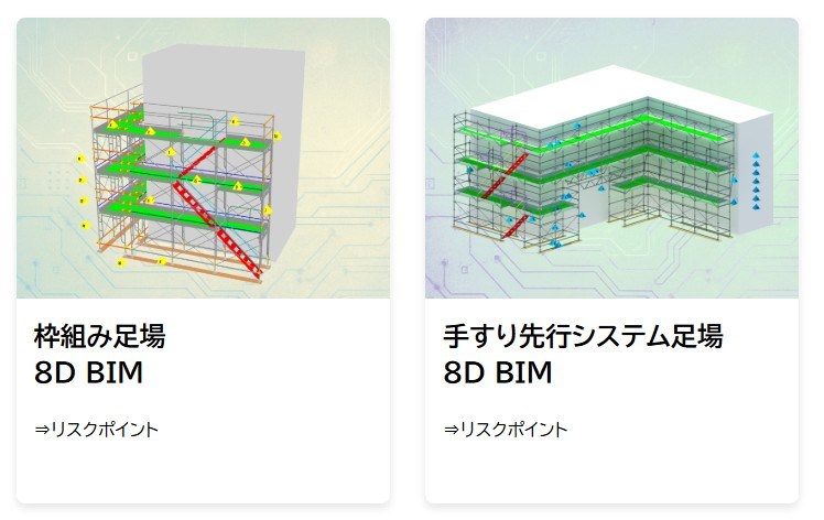 「仮設8D BIM」サイトには、建設現場でよく使われる枠組足場と手すり先行システム足場(くさび緊結式足場) の2種類の足場BIMモデルが表示され、足場の端部、外周部、作業床、脚部、壁つなぎなど、災害が発生しやすい部位ごとに三角形のリスクポイントが表示されています。