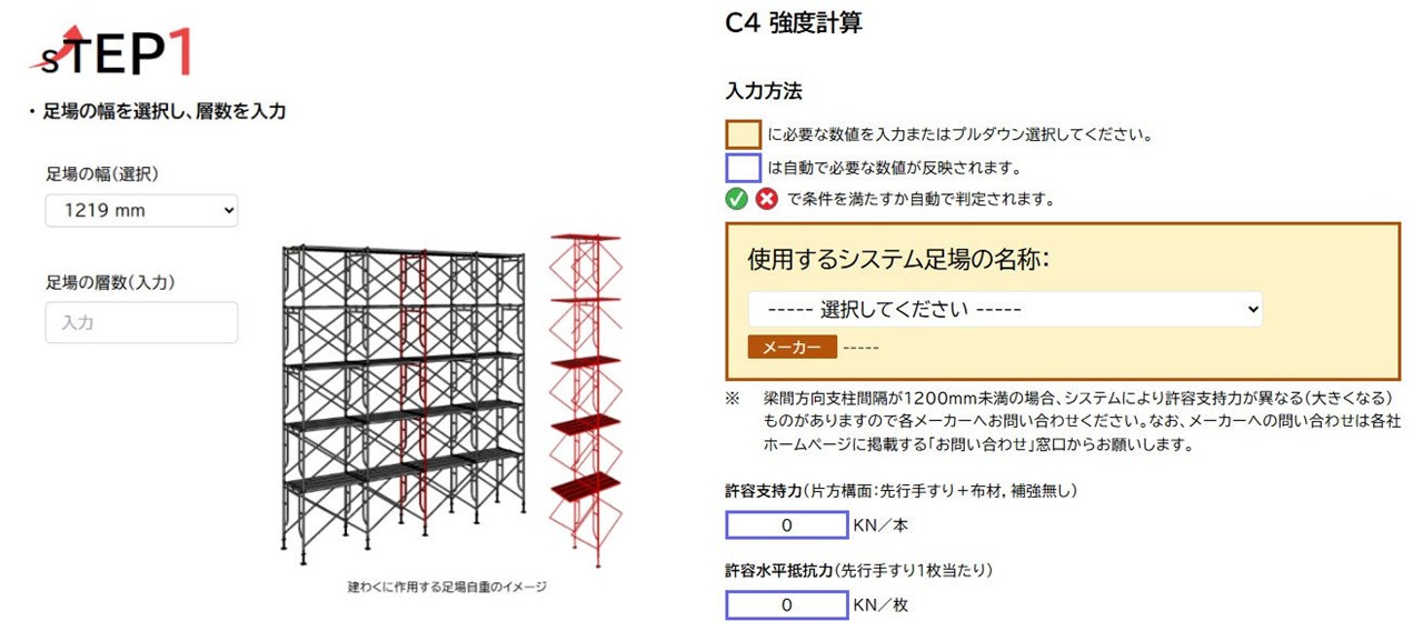 また、モデル連動ではありませんが、強度計算システムも付いており、足場の幅や層数、積載荷重などを入力すると、OKかNGかを判定し、積載荷重の低減などの対策を検討できます。