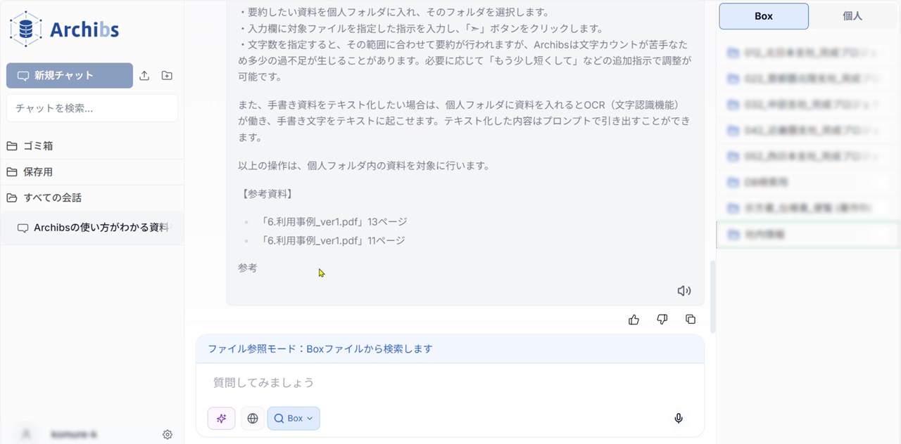 ユーザーが質問を入力すると、Archibsが、指定された範囲の社内資料を検索して、関連性の高い情報を抽出。その内容をもとに、自然な文章で回答を生成します。