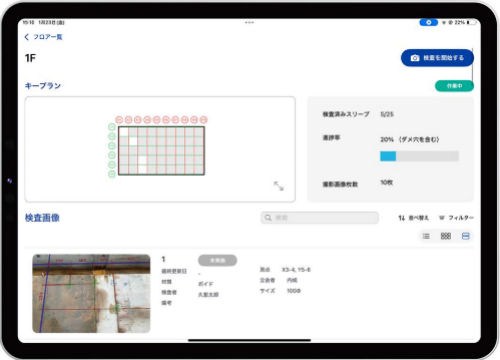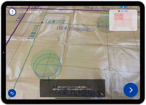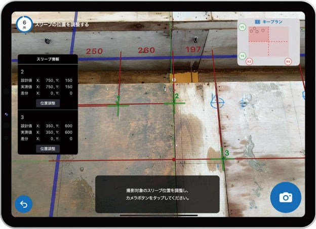 現場ではアプリのAR(拡張現実)機能を使って、検査対象となるスリーブの墨出し線や設置後の現場と、設計図上の重ねて見ながら、iPad Proのカメラでそのまま写真を撮影します。