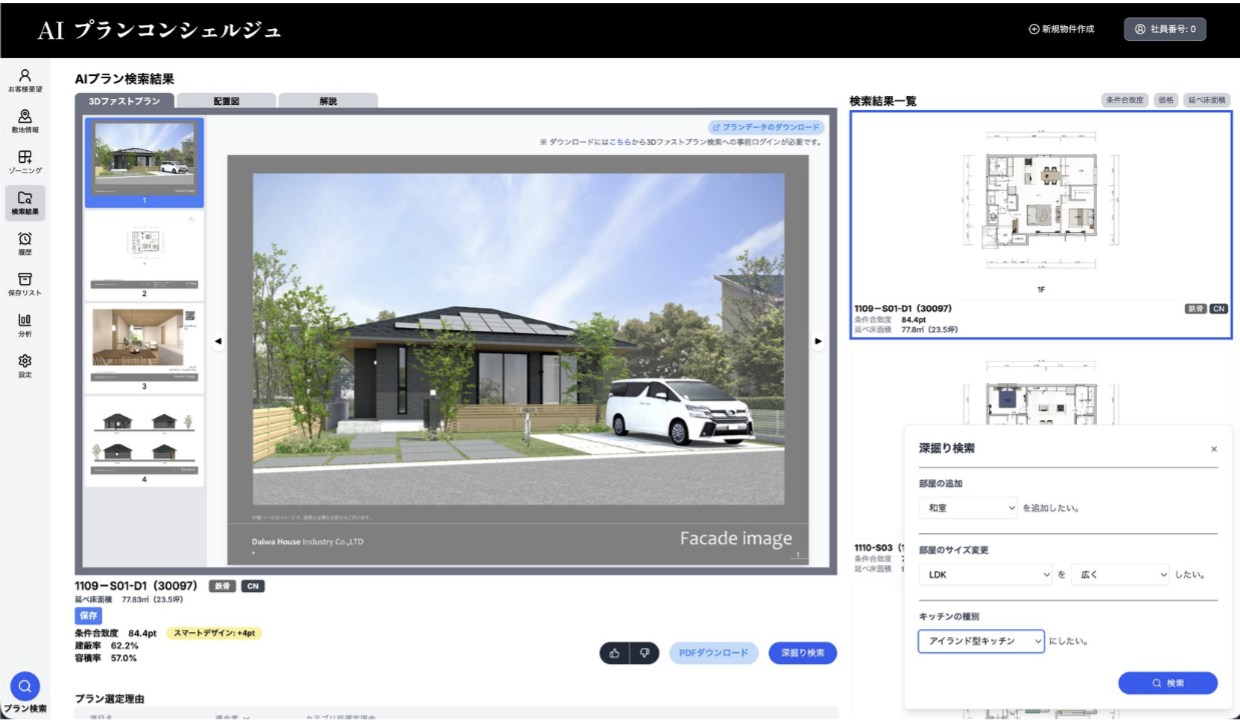 最初の提案で終わりではなく、お客様の要望を受けて、“間取りの壁打ち”をするように、何度でもAIが候補を探してくれます。