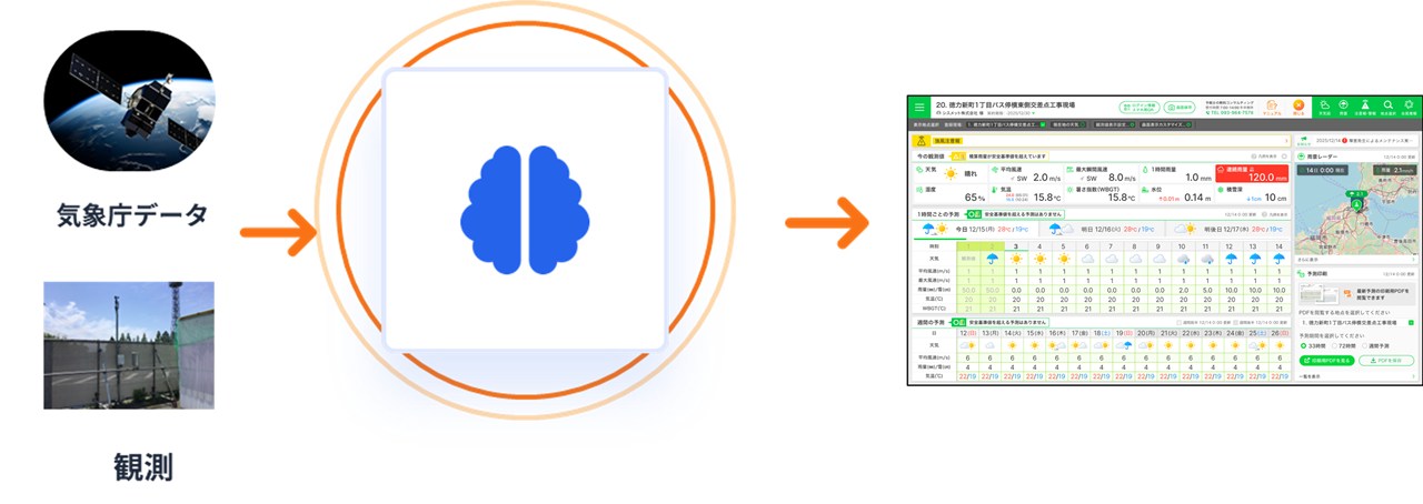 現場に設置した気象観測装置のデータや気象庁の予測データなどをAIで分析し、