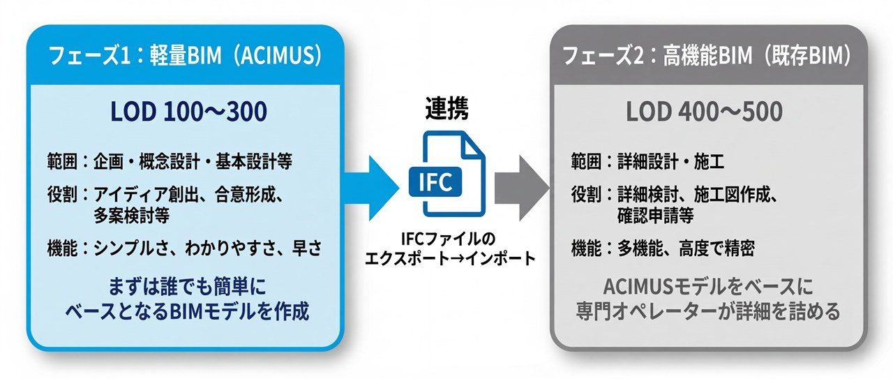 そのため、企画段階はこのシステムでスピーディーに初期のBIMモデルを作成し、IFC形式で出力。設計段階ではRevitやArchicadなど既存のBIMソフトに引き継いで設計を詳細化できます。
