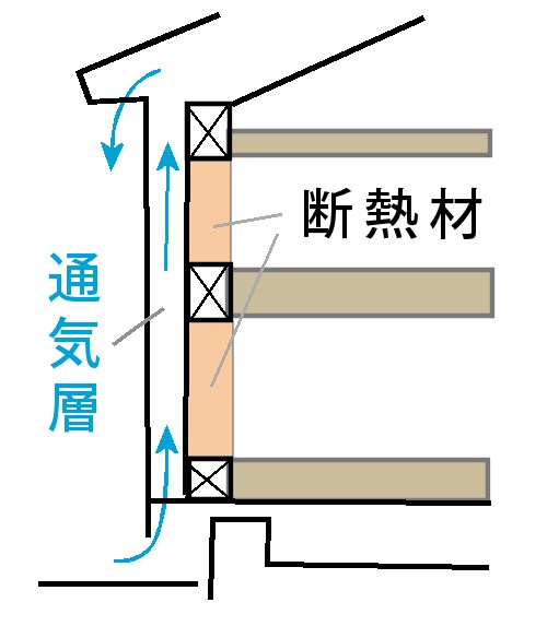 通気層工法のイメージ。壁の内側に通気層があるため、壁体内の湿りや結露は外壁側から見つけにくかった
