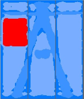 試験壁の検査結果。赤い部分が含水率が高いエリア