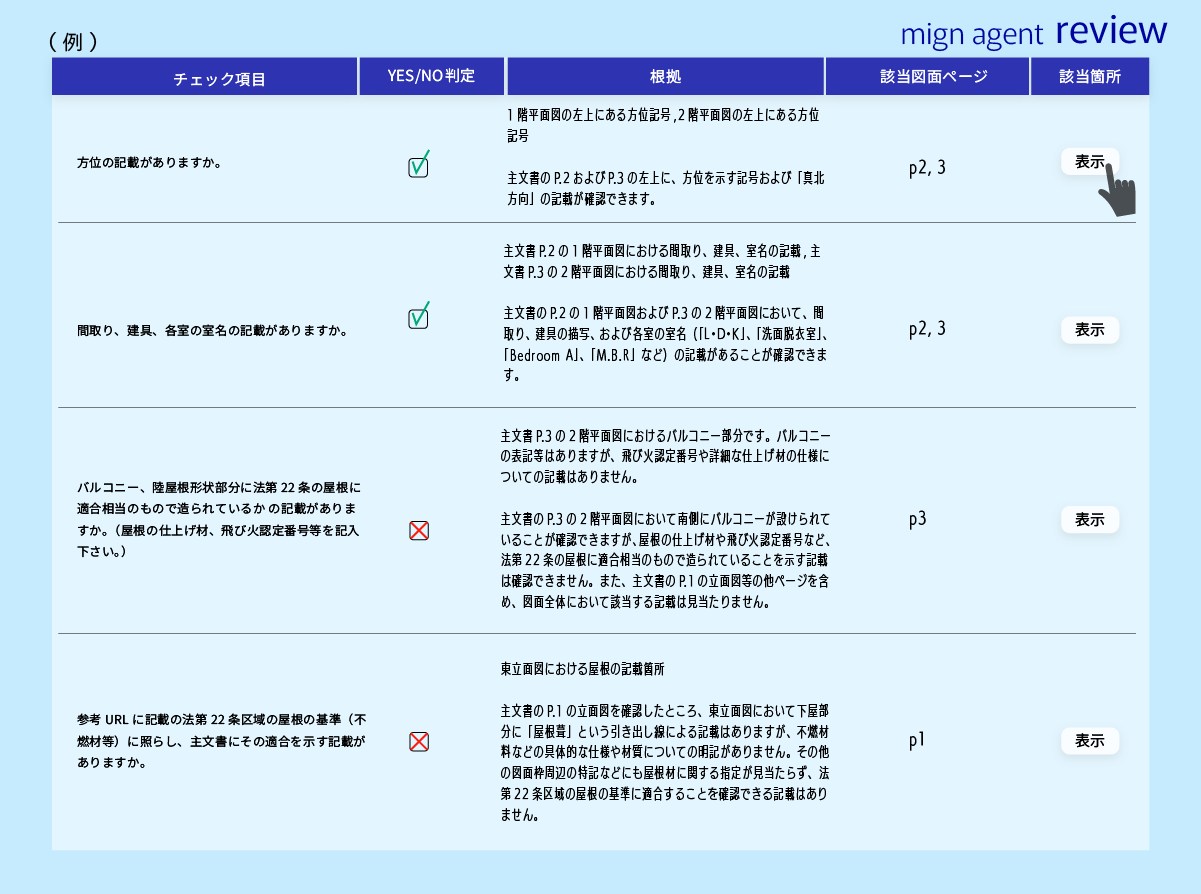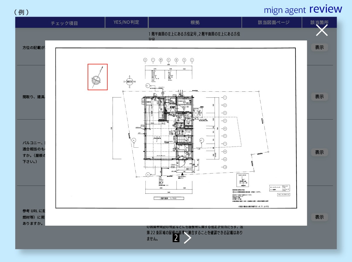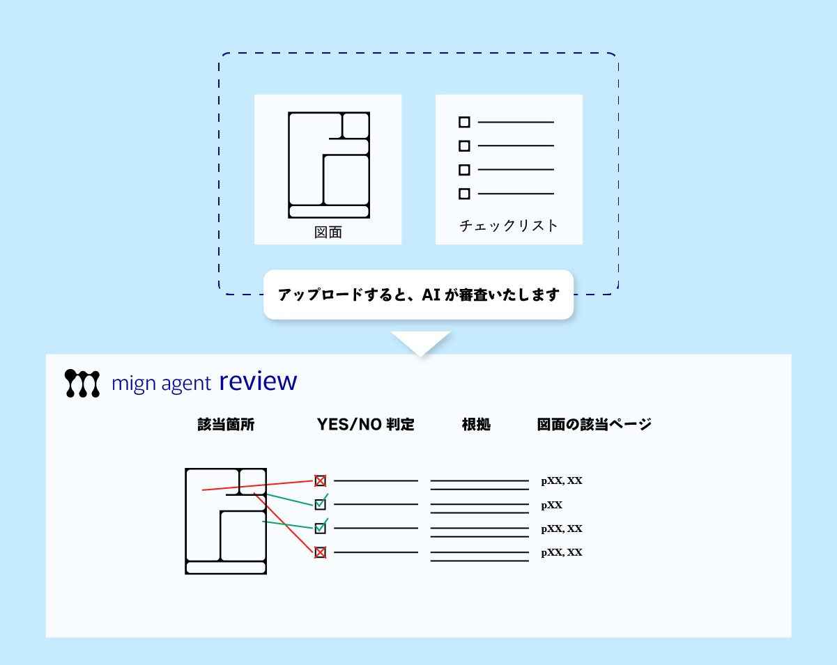 行う作業は、適合性の一次スクリーニング、数百枚に及ぶ図面の中から該当ページを自動特定、対象箇所のハイライト表示、さらに審査判断の根拠提示です。