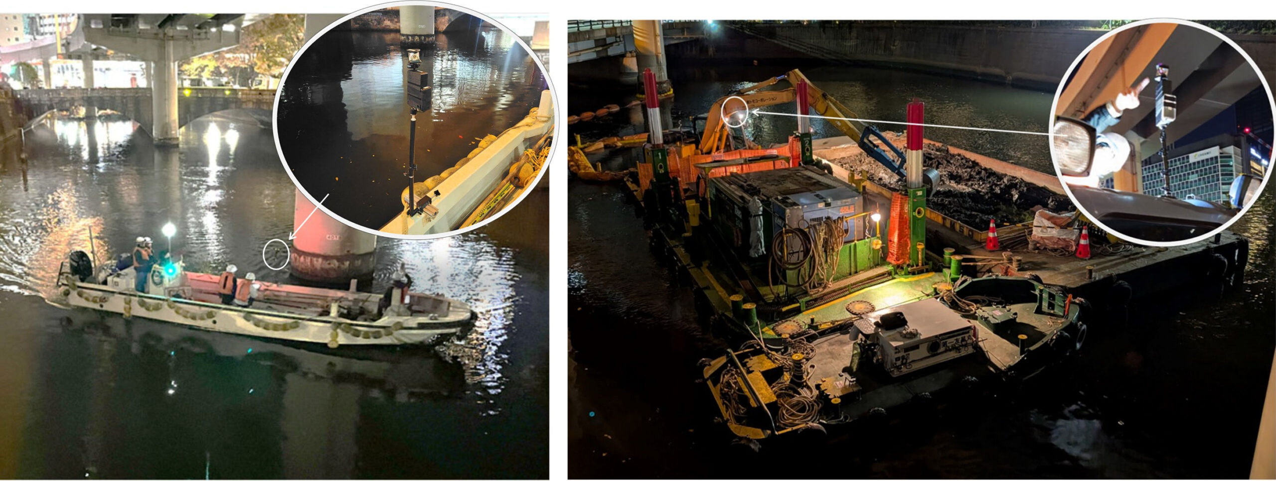 今回の実証実験では、首都高速道路高架橋下の施工エリアに基地局を12カ所設置し、日本橋川を行き来する通船を追尾しました。 さらに、浚渫作業を行う台船上のバックホウでは、運転席と車体後部に移動局を取り付け、ブームの旋回状況まで追尾しています。