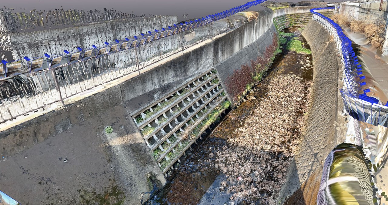 さらに、空撮との相性もよい。大規模案件ではドローンで俯瞰データを、PIX4Dcatchで死角や地上付近を——それぞれの得意領域で撮影し、ひとつの点群として統合できる。