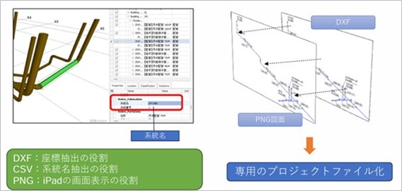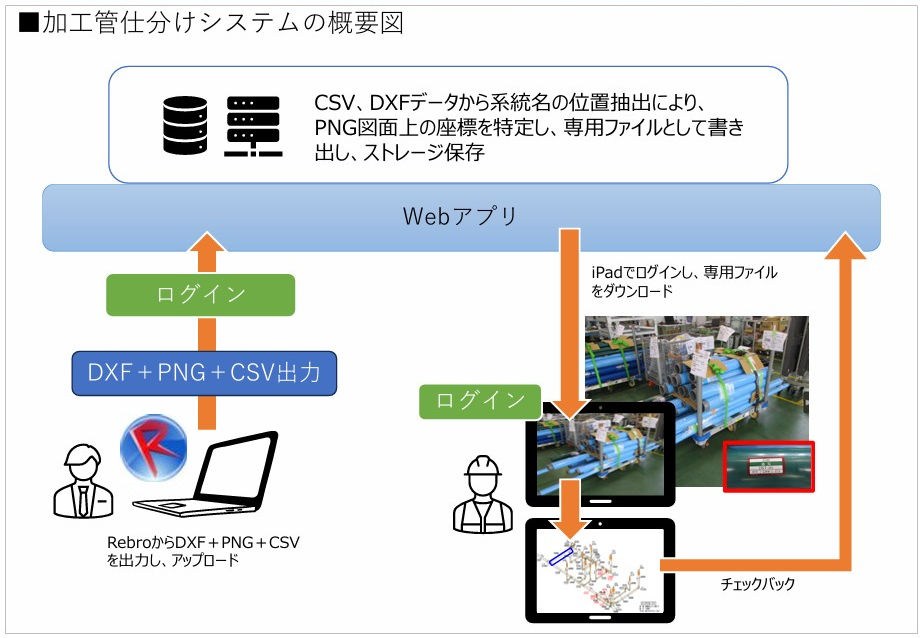 システムは、WebアプリとiPadアプリで構成される。まず、ヤマトが設計に用いる設備BIMソフト「Rebro」から出力された DXF・PNG・CSVの各データを解析し、そこから系統名や部材番号を抽出する。