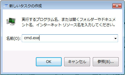 - 「cmd.exe」と入力し、OKボタンをクリックします。