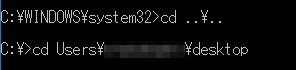 - コマンドプロンプトが起動しますので、デスクトップに移動します。 cd:現在のフォルダを変更するコマンドです。 「..」は、1つ上のフォルダを示します。