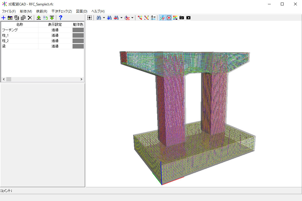 3D配筋CADは、土木構造物の躯体や鉄筋を実際の寸法で3次元表示することで、複雑な配筋状態を確認することができるほか、躯体・鉄筋の新規作成、鉄筋同士の干渉チェック、および、2次元図面作成、3次元データのエクスポートが可能な3次元CADプログラムです。国土交通省が推進するCIM(Construction Information