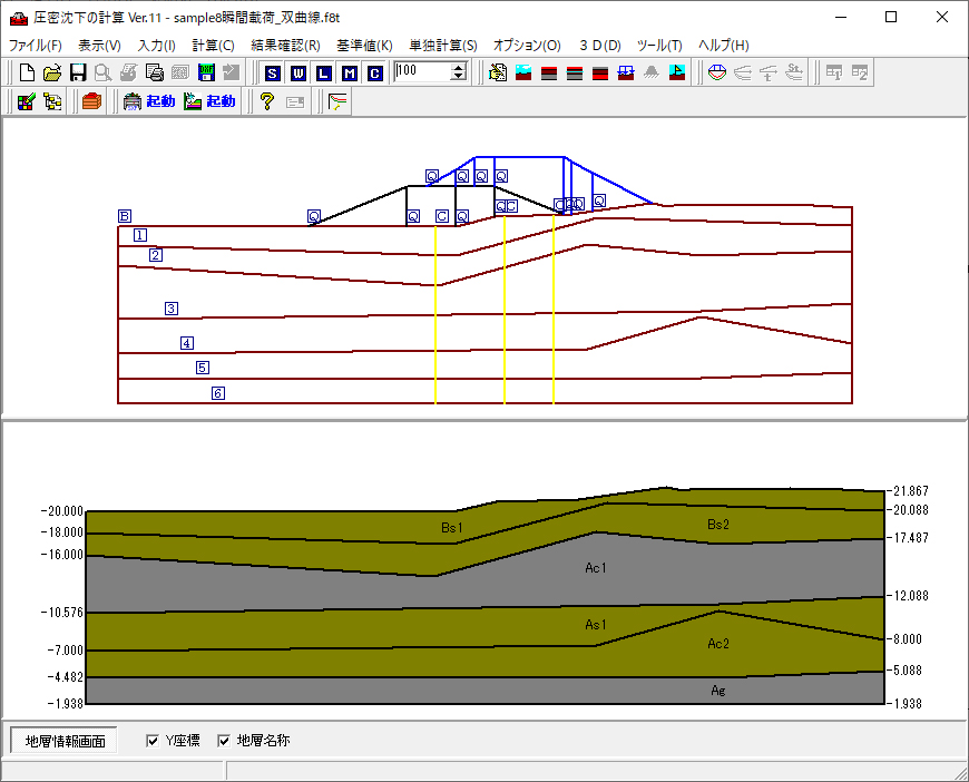 | 「土工指針」や「NEXCO」、「軟弱地盤対策工指針」、「鉄道」、「港湾」等の各種設計基準類に規定されるTerzaghiの一次元圧密理論に基づく圧密沈下解析プログラム。