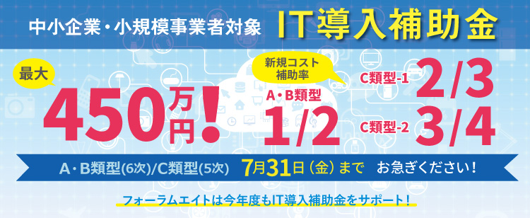 IT導入補助金は、中小企業・小規模事業者等の課題やニーズに合ったITツール導入費の一部を補助することで、業務効率化・売上アップをサポートする制度です。フォーラムエイトは「認定情報処理支援機関(愛称:スマートSMEサポーター)」の認定を取得しており、交付審査で必要、あるいは有利になるツール・規格の利用も含め、みなさまの補助金申請をサポートします。今回、昨今の新型コロナウイルス感染症が、事業環境に与えた影響への対策及び同感染症の拡大防止に向け、具体的な対策(サプライチェーンの毀損への対応、非対面型ビジネスモデルへの転換、テレワーク環境の整備等)に取り組む事業者のITツールの導入を優先的に支援するために、特別枠(C類型)が追加されました。通常枠(A・B類型)では補助対象とならないハードウェアレンタル等が補助されます。