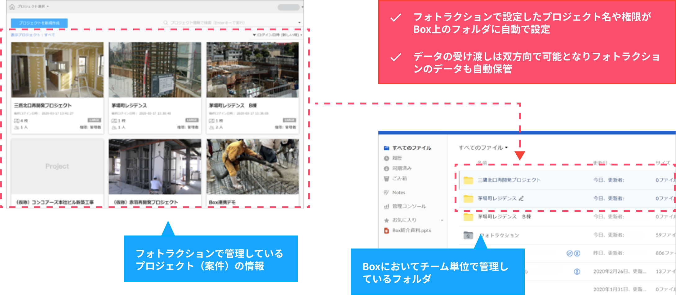 「Photoruction」のプロジェクト情報が「Box」と連動し、ユーザーやフォルダ権限などが案件毎に自動的に設定されます。
