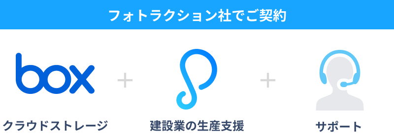建設業の生産支援クラウド「Photoruction(フォトラクション)」と世界的なクラウドストレージサービス「Box(ボックス)」をセットで利用できるフォトラクション社オリジナルのサービスです。