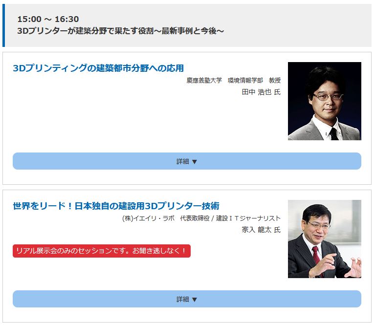 昨年と同じく、慶應義塾大学 環境情報学部 教授の田中浩也氏による特別講演「3Dプリンティングの建築都市分野への応用」も同じセッションですので、お聞き逃しなく!