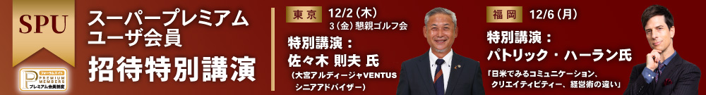- この度、SPU会員特典として、『SPU招待特別講演会』(5/12 横浜ベイコート倶楽部開催)を新たに企画いたしました。特別講演には、弊社TVCM出演中のパックンことパトリック・ハーラン氏をお招きしております。